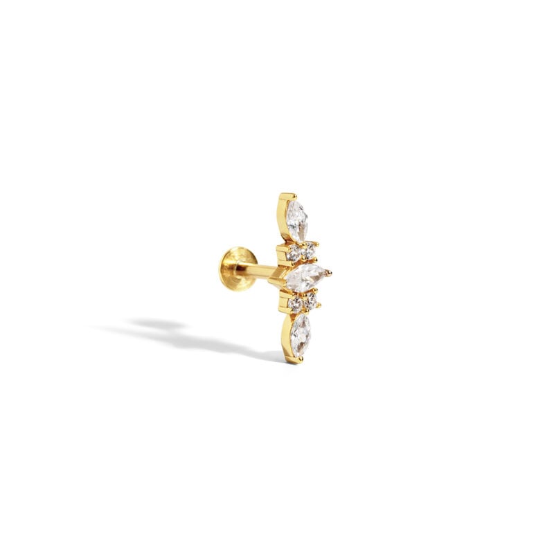 עגיל פירסינג רויאל בעיצוב אלגנטי ומוארך, עשוי כסף אמיתי 925 איכותי בציפוי זהב 14 קראט.